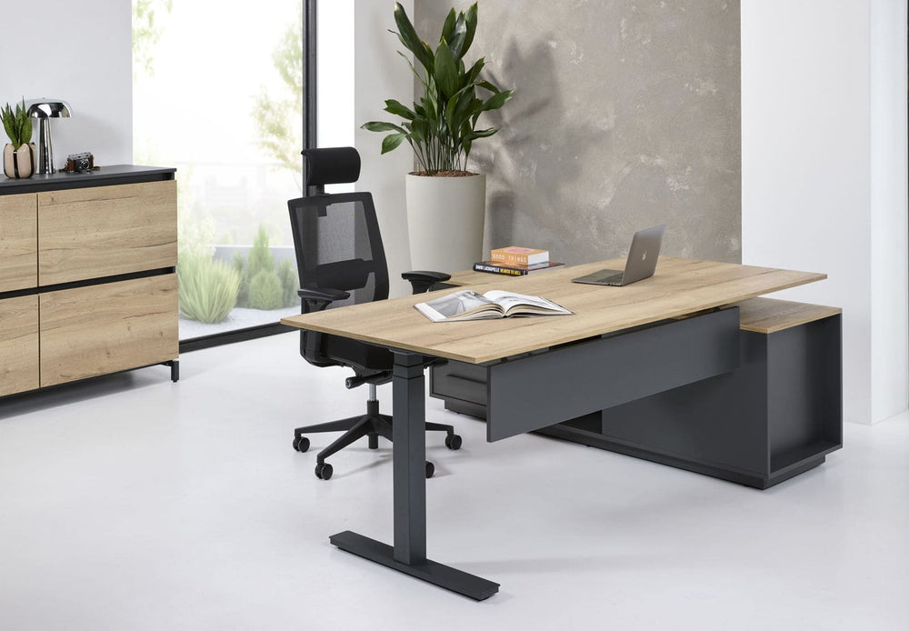 Un bureau de direction doit s’intégrer harmonieusement au décor existant. Le design sobre et contemporain d’Up&Desk, avec son piètement anthracite et son plateau en chêne brut mélaminé, s’adapte aussi bien aux environnements modernes qu’aux espaces plus traditionnels. Les dimensions doivent être choisies avec soin pour éviter l’encombrement tout en garantissant un plateau spacieux.