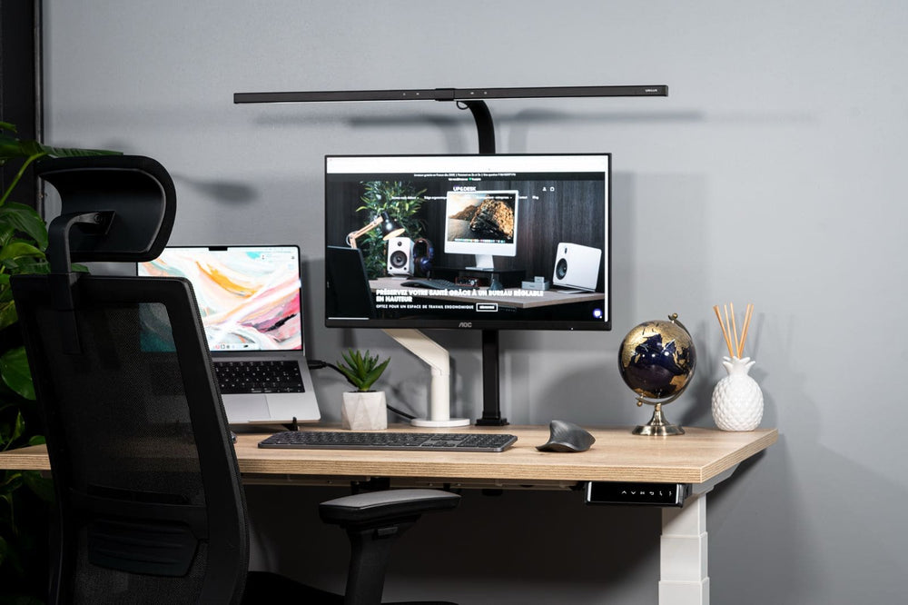 Associez le bras à un bureau Up&Desk réglé sur 65–130 cm, mettez l’écran au niveau des yeux ou légèrement en dessous, perpendiculairement aux fenêtres, et conduisez les câbles vers la goulotte pour une montée/descente sans traction.