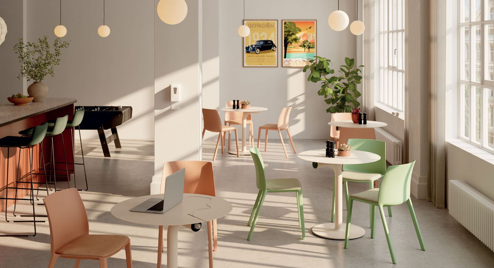 La modularité : certaines tables rondes peuvent être réglées en hauteur ou associées à d’autres éléments.